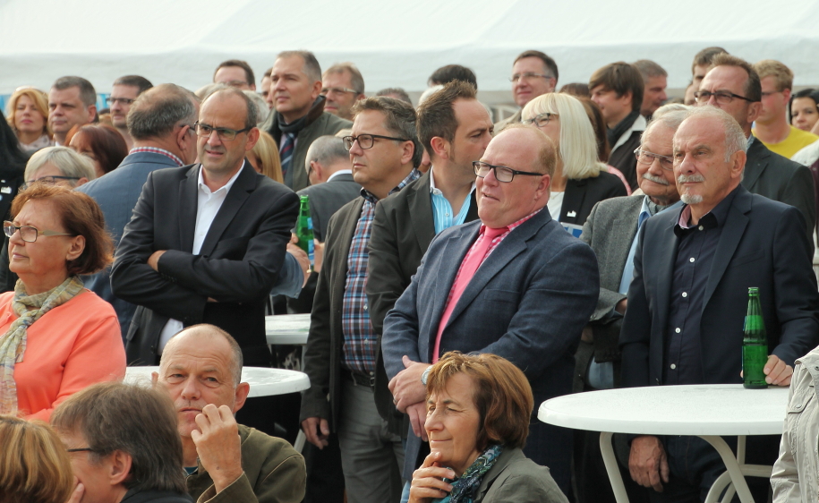 50 Jahre SPD-Ortsverein Niedersaubach-Rümmelbach, Festveranstaltung am 3. Oktober 2014 im Niedersaubacher Antoniusheim, Werner Schmidt erhält aus den Händen von Staatssekretär Jügen Barke und Generalsekretärin Petra Berg die Willy-Brandt-Medaille